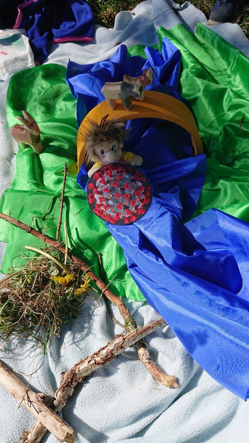 I dag har vi hatt samling i skogen i de ulike kohortene. Bukkene Bruse skulle til setra for sommeren, men ble stoppet av trollet som fikk korona-virus. De måtte holde seg innendørs i huset sitt, spille spill og kunne ikke leke med vennene sine. Da trollet ble frisk gikk han selv på setra og hentet gress og mat til Bukkene Bruse som ble kjempe glad.
