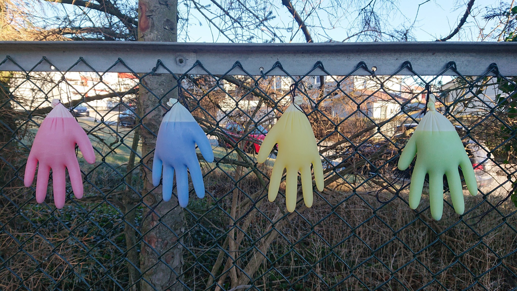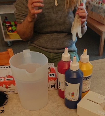 Vi laget 9 hansker med rent vann og blandet maling i 4 hansker. Vi brukte primærfargene: en hanske ble rød, en ble blå, en ble gul og vi blandet blå og gul maling i en - den ble da grønn. Barna klemte på malingen i vannet og vannet ble fargerikt.