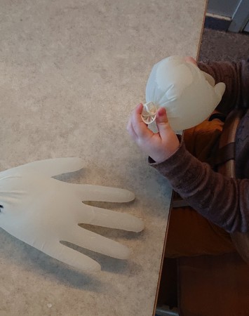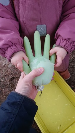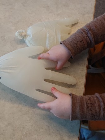 Vi kjente på vanndråper og fylte vann i gummihansker. Da hørte vi lyden av vannet som sildret oppi hansken, og vi klemte og trykket på hansken etterpå når det var vann i den. Det var vobblete og laget lyd når vi ristet på hansken.