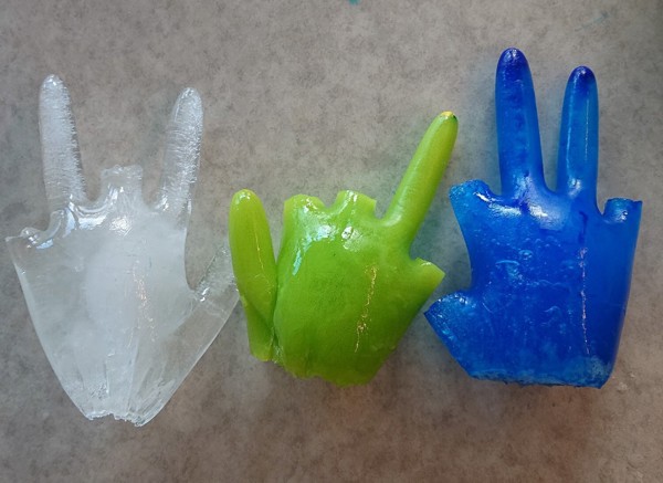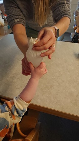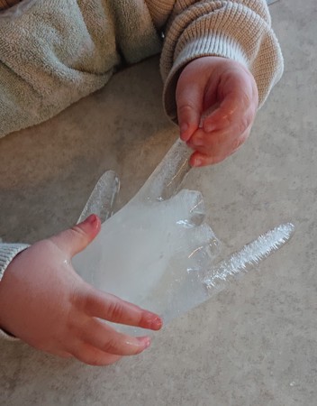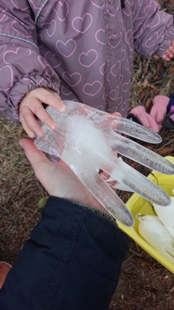 Hanskene hang ute og vi var spente på om de hadde frosset til is iløpet av helgen. Idag når vi sjekket så var vannet frosset til hard og kald is. Vi kjente på isen uten hansker og tok ishendene med oss inn. Før lunsj fikk alle barna utdelt en blank isfing hver. Noen synes det var veldig godt og ønsket mer og mer - mens andre synes det var noe kaldt :) Ishendene dryppet vann når vi holdt på med våre varme hender - og isen ble igjen til dråper på bordet foran oss. Spennende!